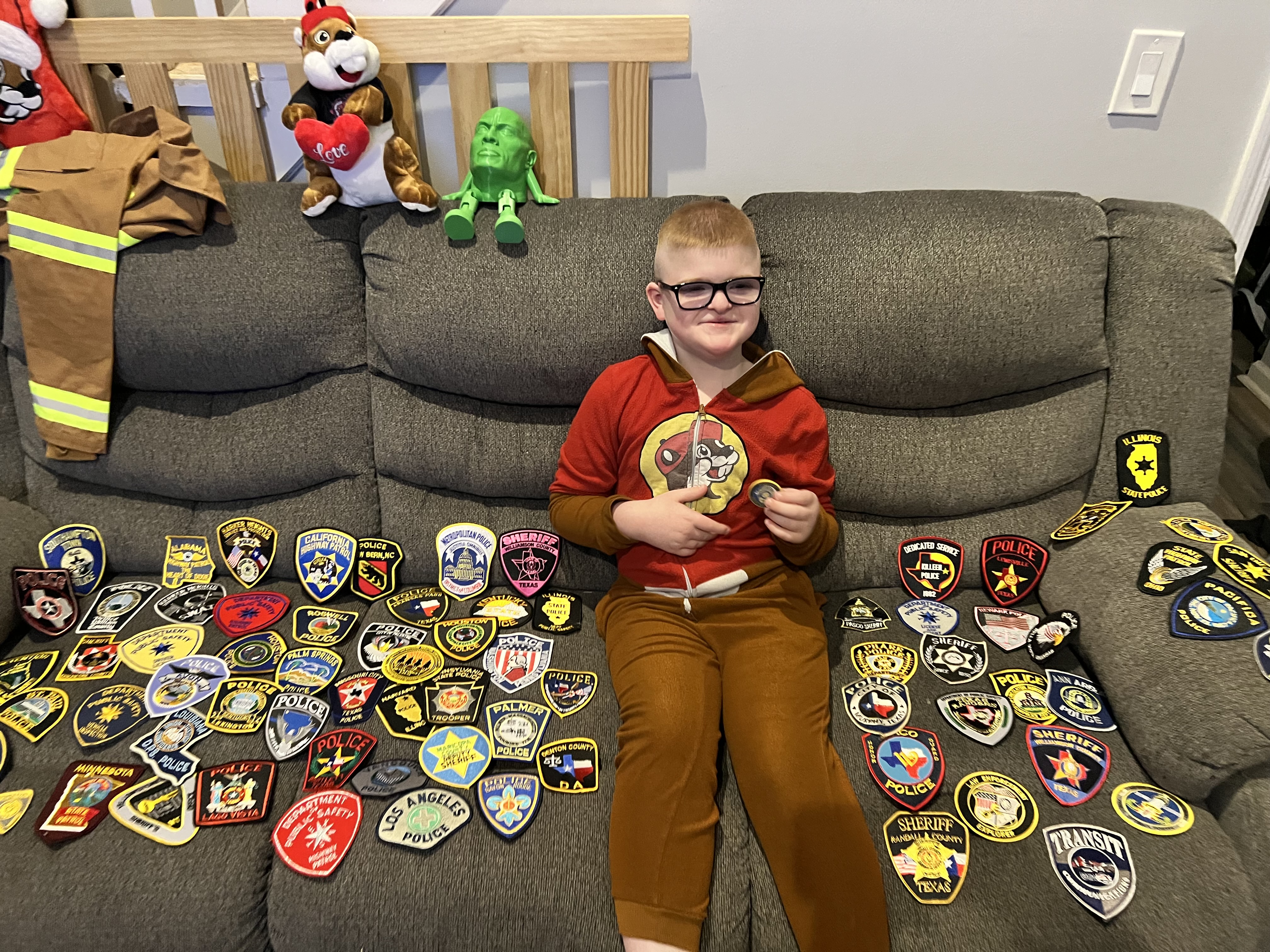 I love Santa, Buc-ee's, fire trucks, and police cars. I enjoy visiting the fire station and hanging out with the firefighters. I collect fire, police, and EMS patches from places we visit, but I would like to expand my collection.