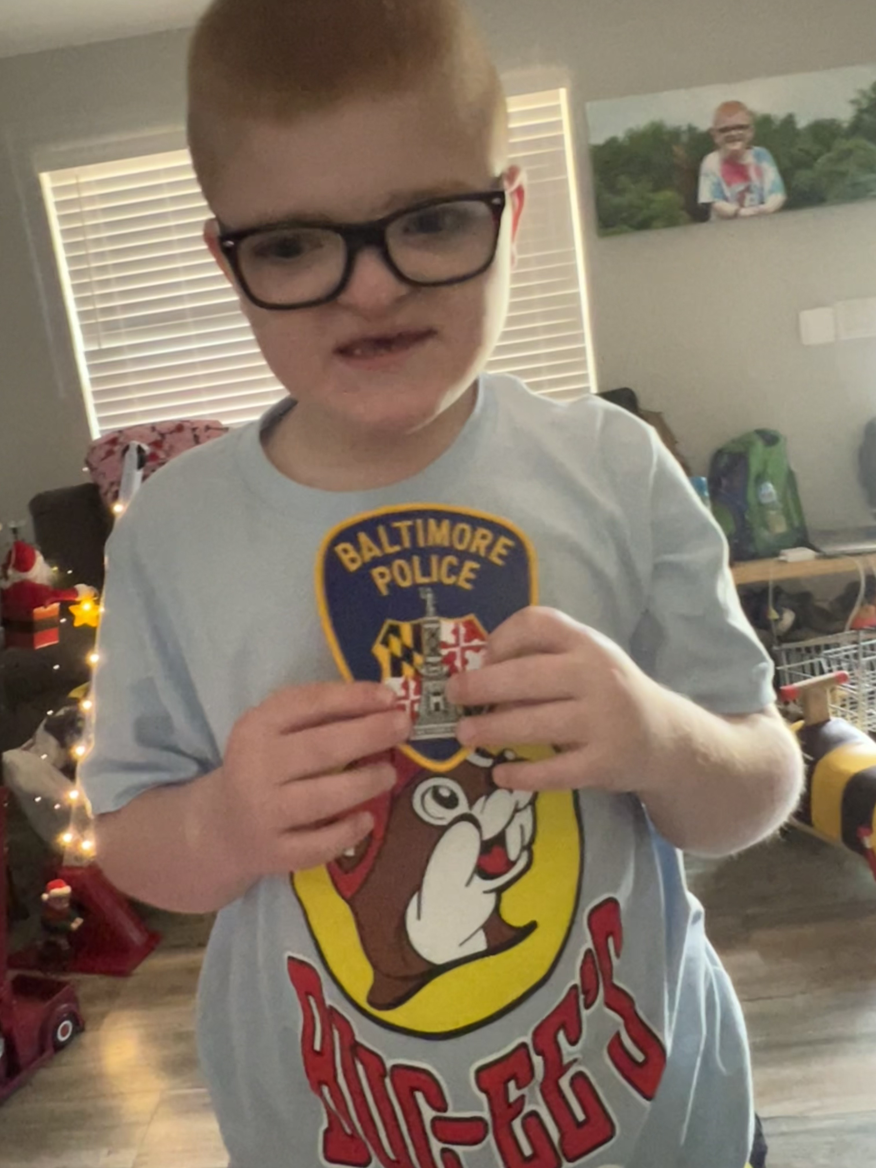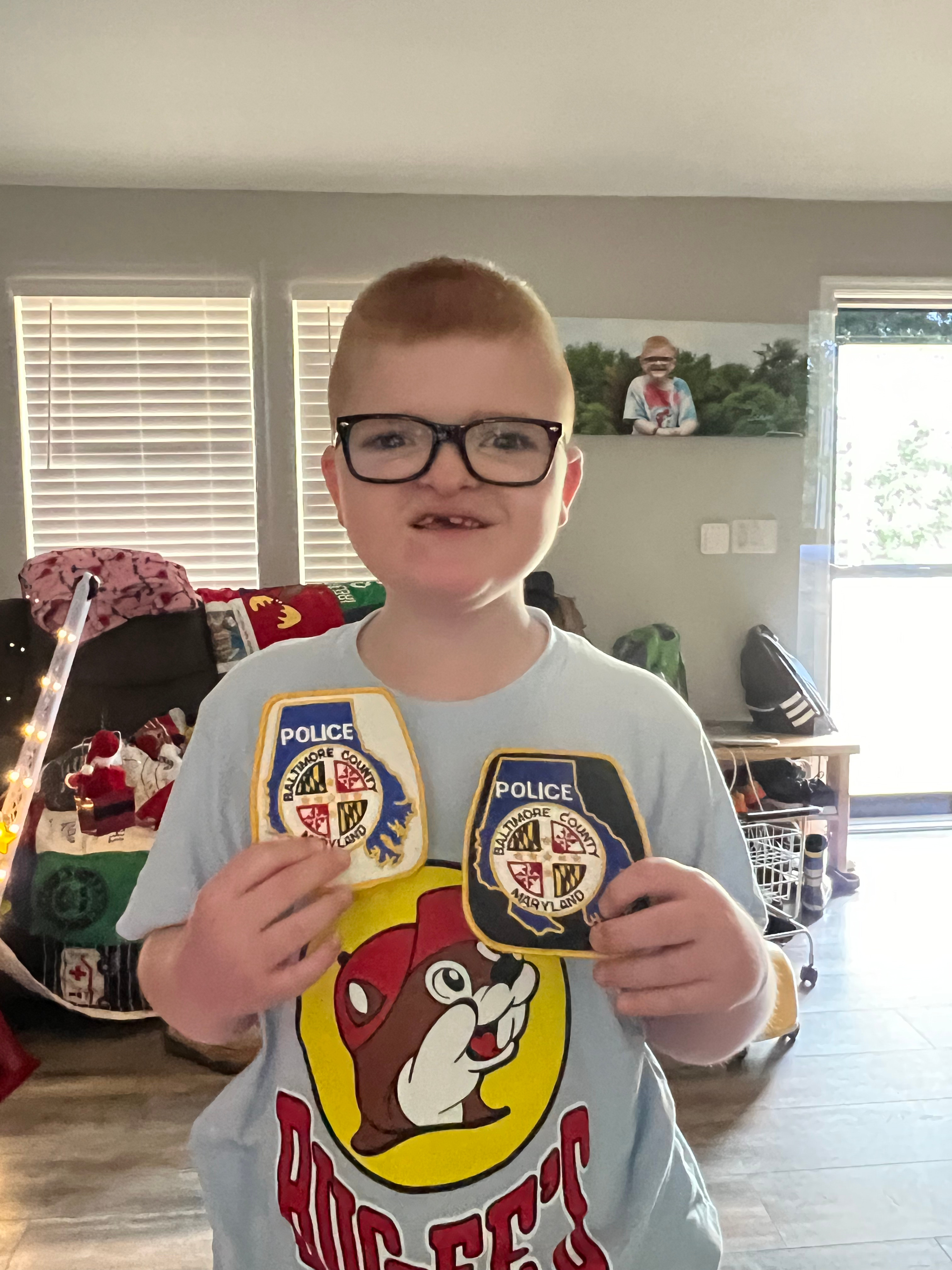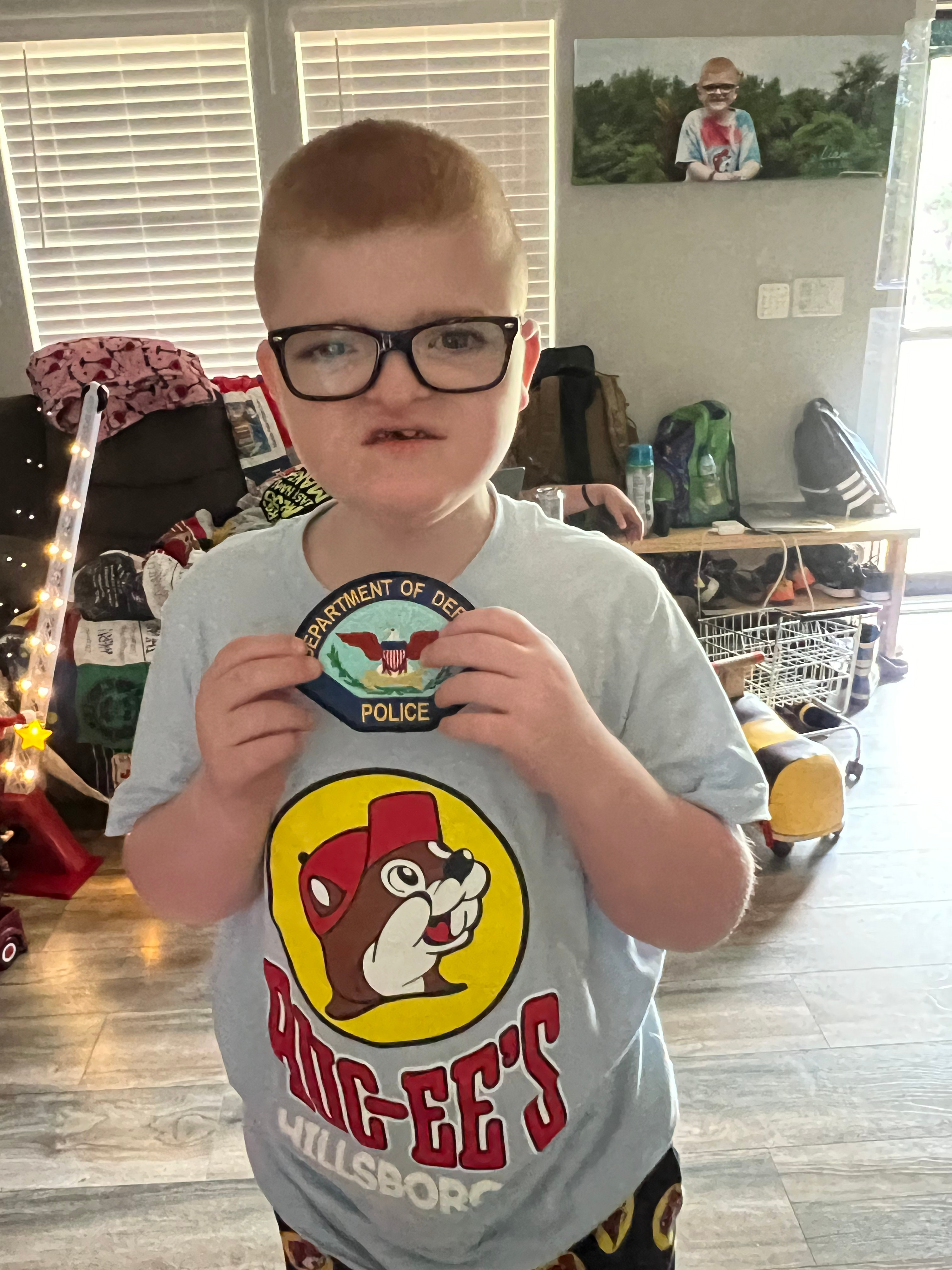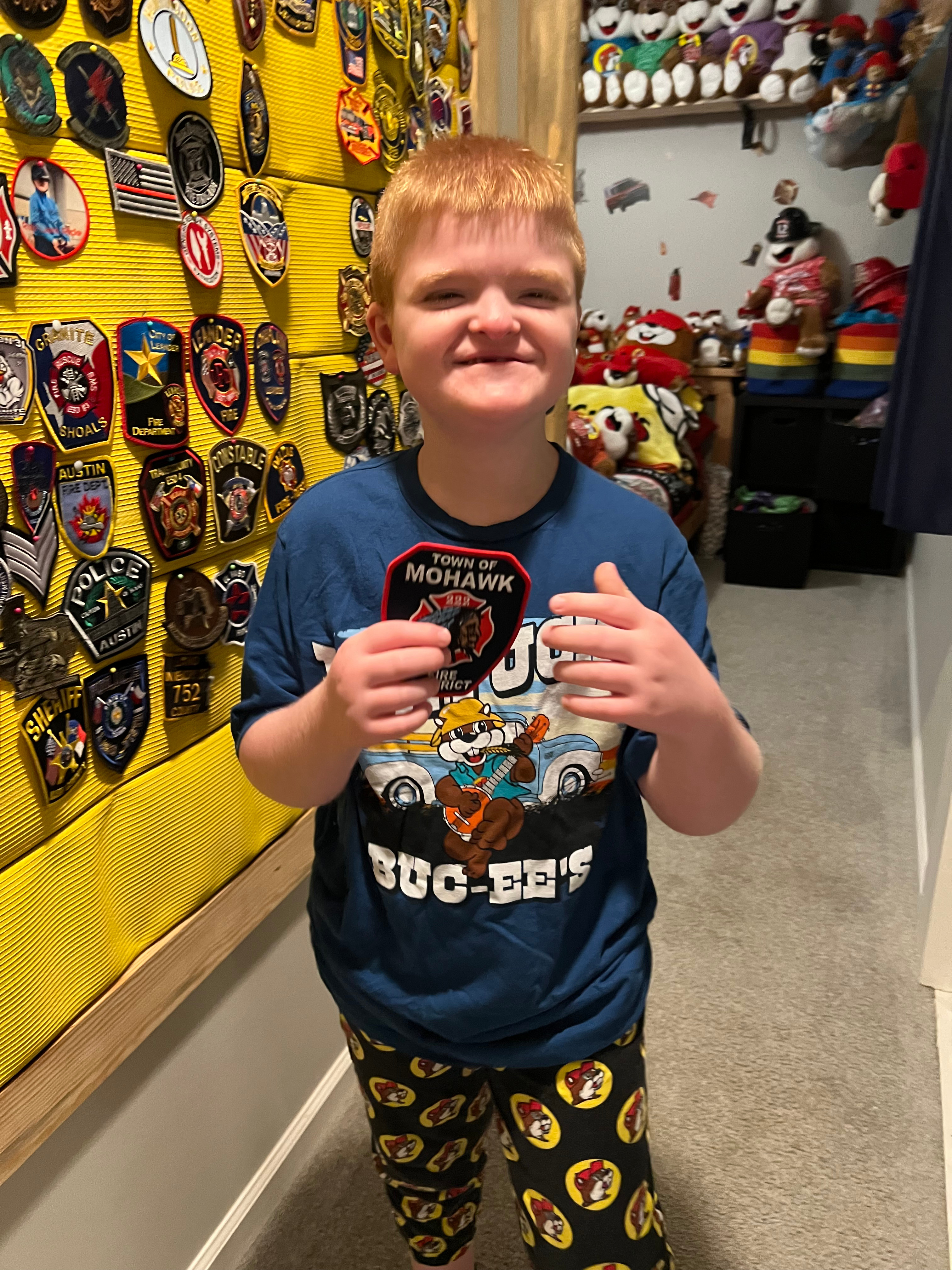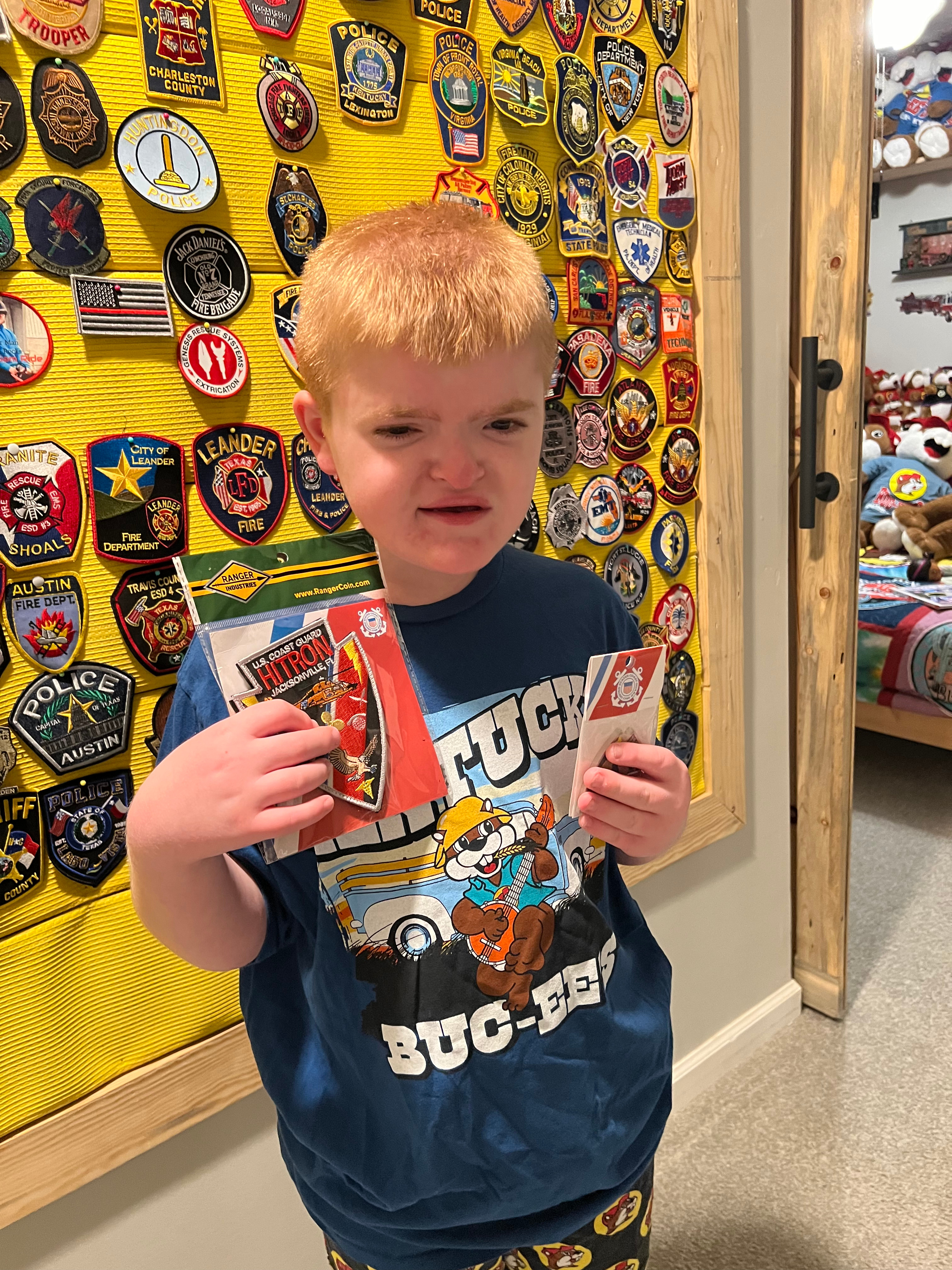I love Santa, Buc-ee's, fire trucks, and police cars. I enjoy visiting the fire station and hanging out with the firefighters. I collect fire, police, and EMS patches from places we visit, but I would like to expand my collection.
