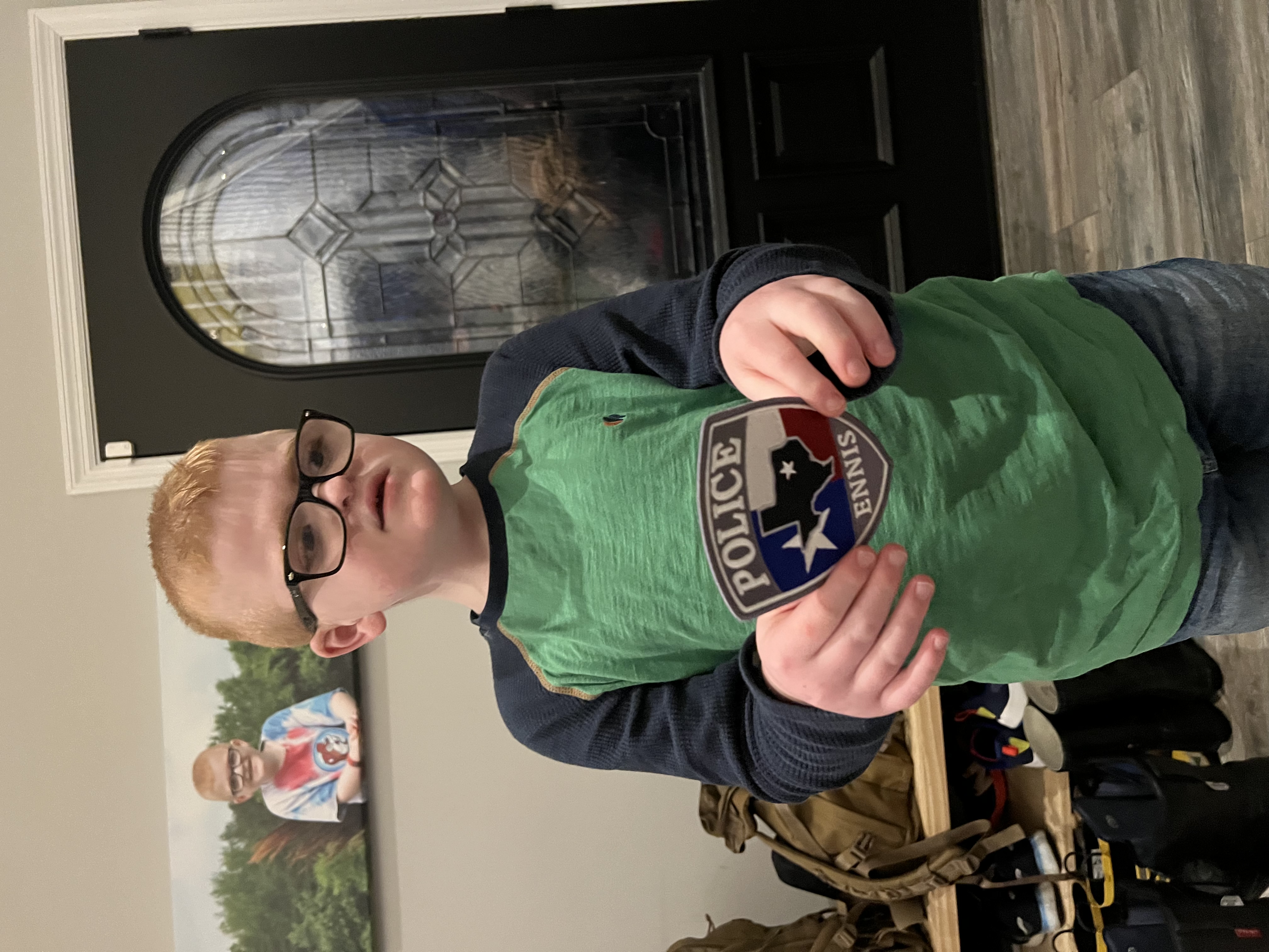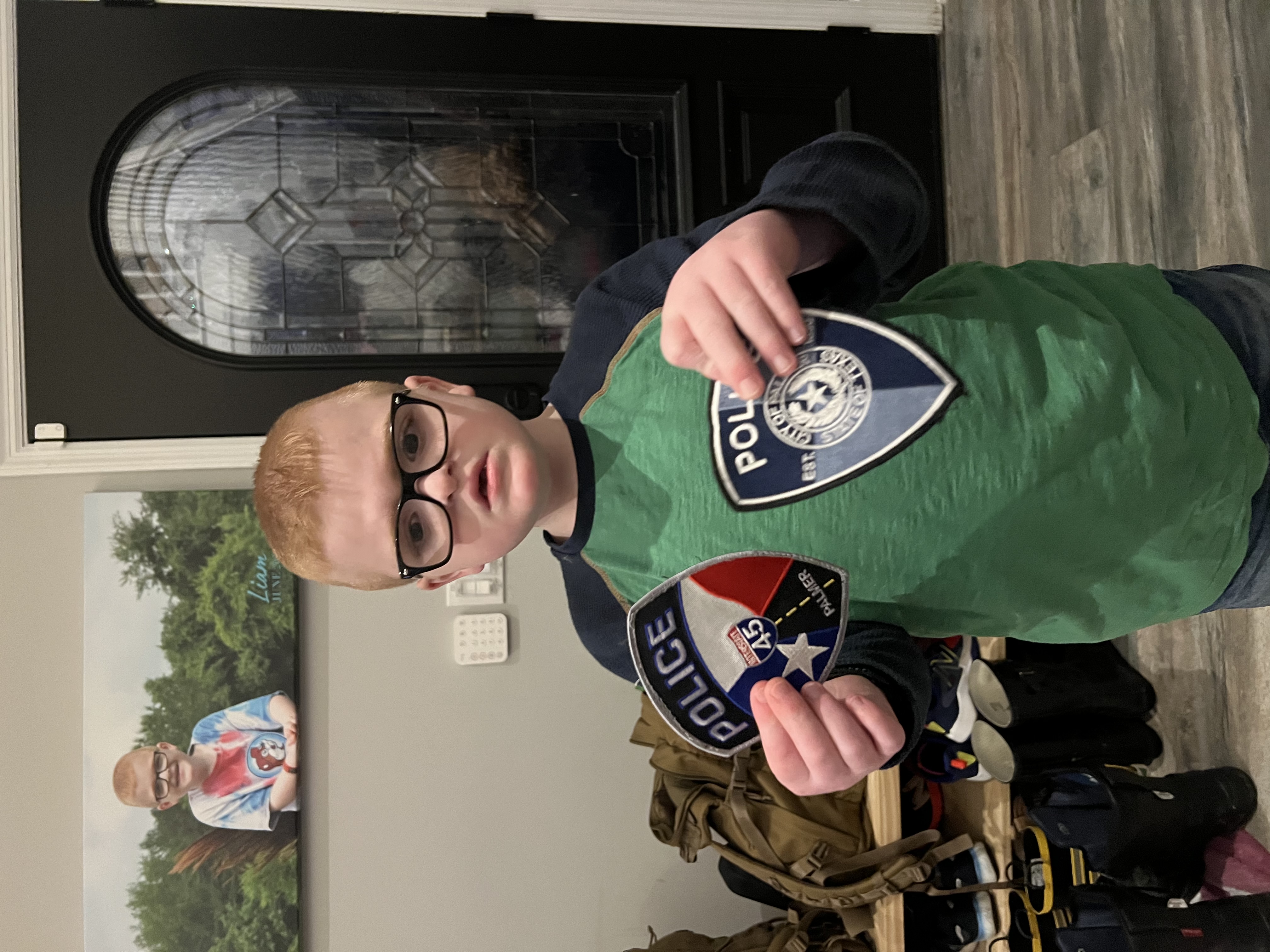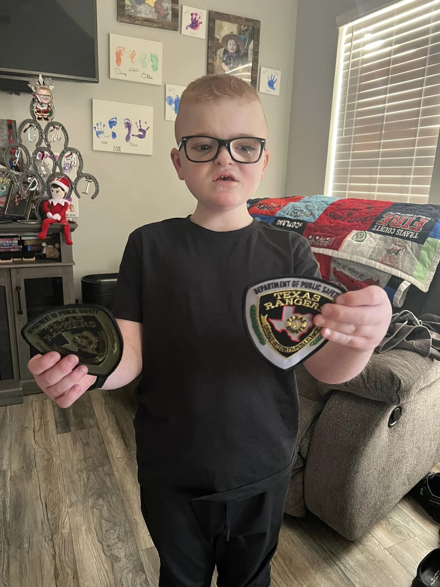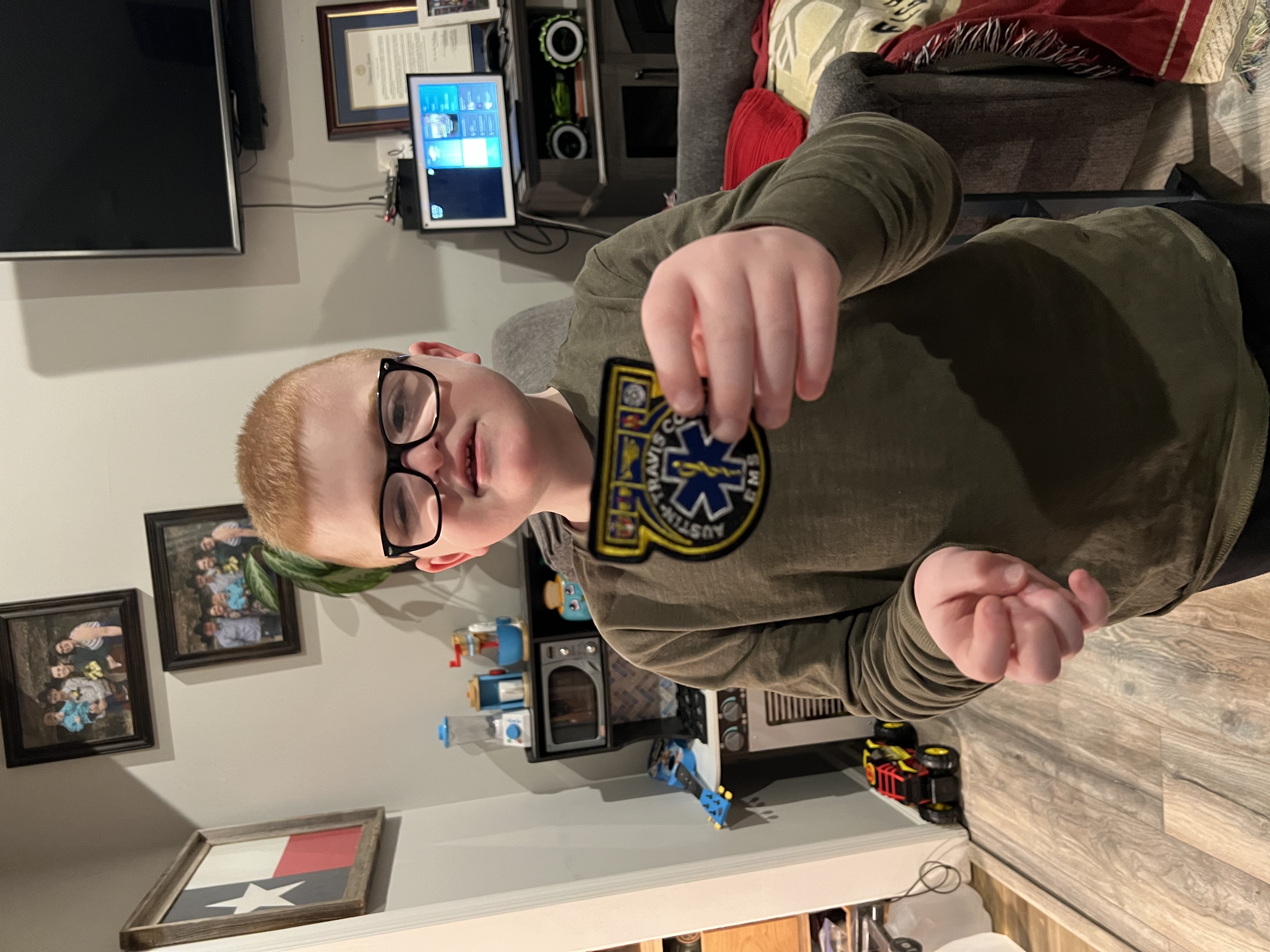 I love Santa, Buc-ee's, fire trucks, and police cars. I enjoy visiting the fire station and hanging out with the firefighters. I collect fire, police, and EMS patches from places we visit, but I would like to expand my collection.