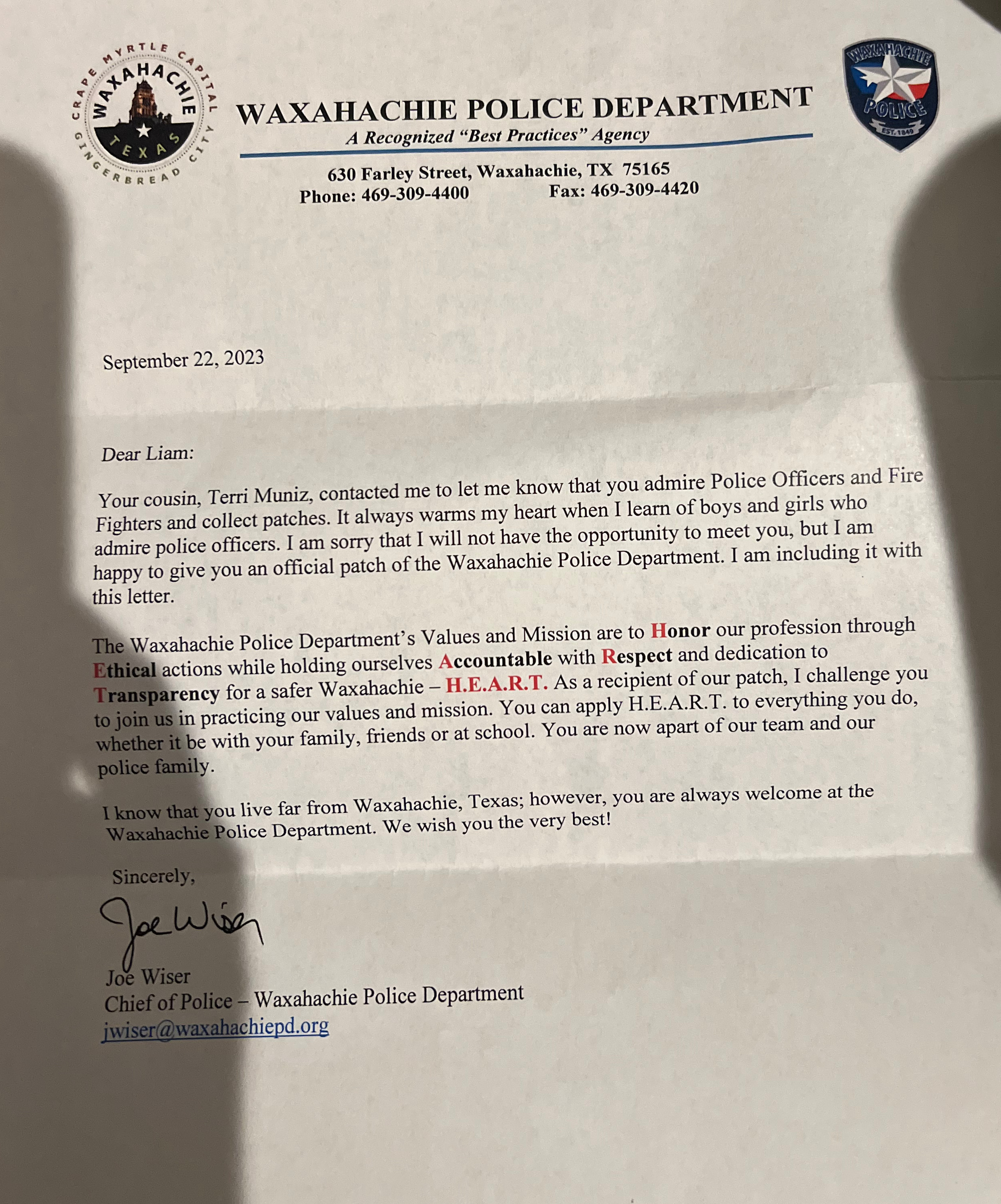 Thank you Chief Wiser and the Waxahachie Police Department for the patch and the nice letter!